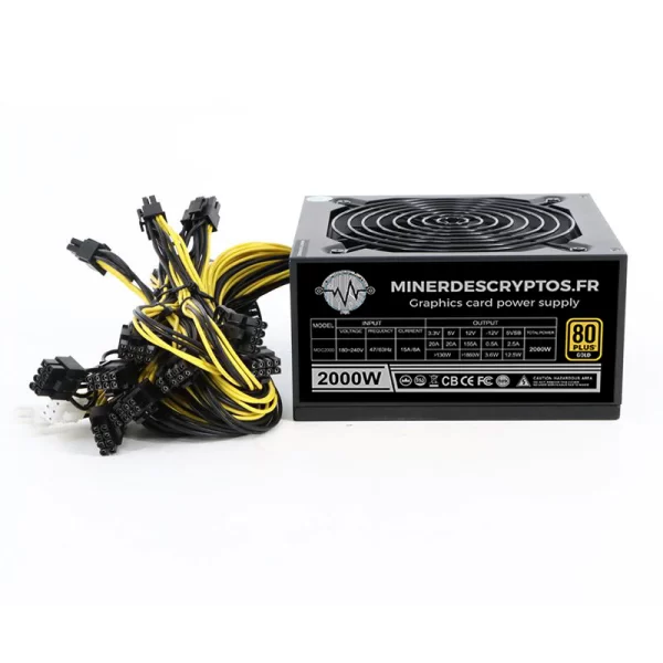 1. Puissance : 2000w 2.DC Voltage : 12.0V,ATX 3.Ports: 1*ATX24pin,1*cpu(4+4)pin,16*8(6+2)pin,3*IDE,8*SATA 4.Taille: 150*85*165mm Certification 80 Gold Plus. LA SEULE QUI EXISTE,